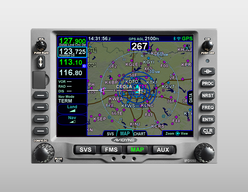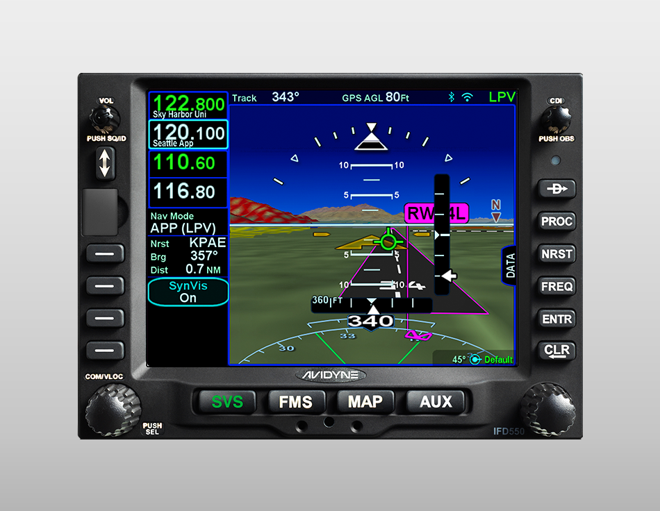 The IFD550 is Avidyne’s Premium panel-mounted FMS solution. The IFD550 has all the features and power of the IFD540 with the added benefit of 3-dimensional “ego-centric/ out-the window” Synthetic Vision views. Thanks to its integrated Attitude Reference System (ARS) and Dynamic SVS, you can “see” all your flight information laid out in front of you, giving you unprecedented situational awareness. Synthetic Vision shows terrain in 3D with hazard alerting, obstacles, and traffic. Everything you need to see on a bright, easy-to-view 5.7” touchscreen. Easy slide-in replacement for GNS530!